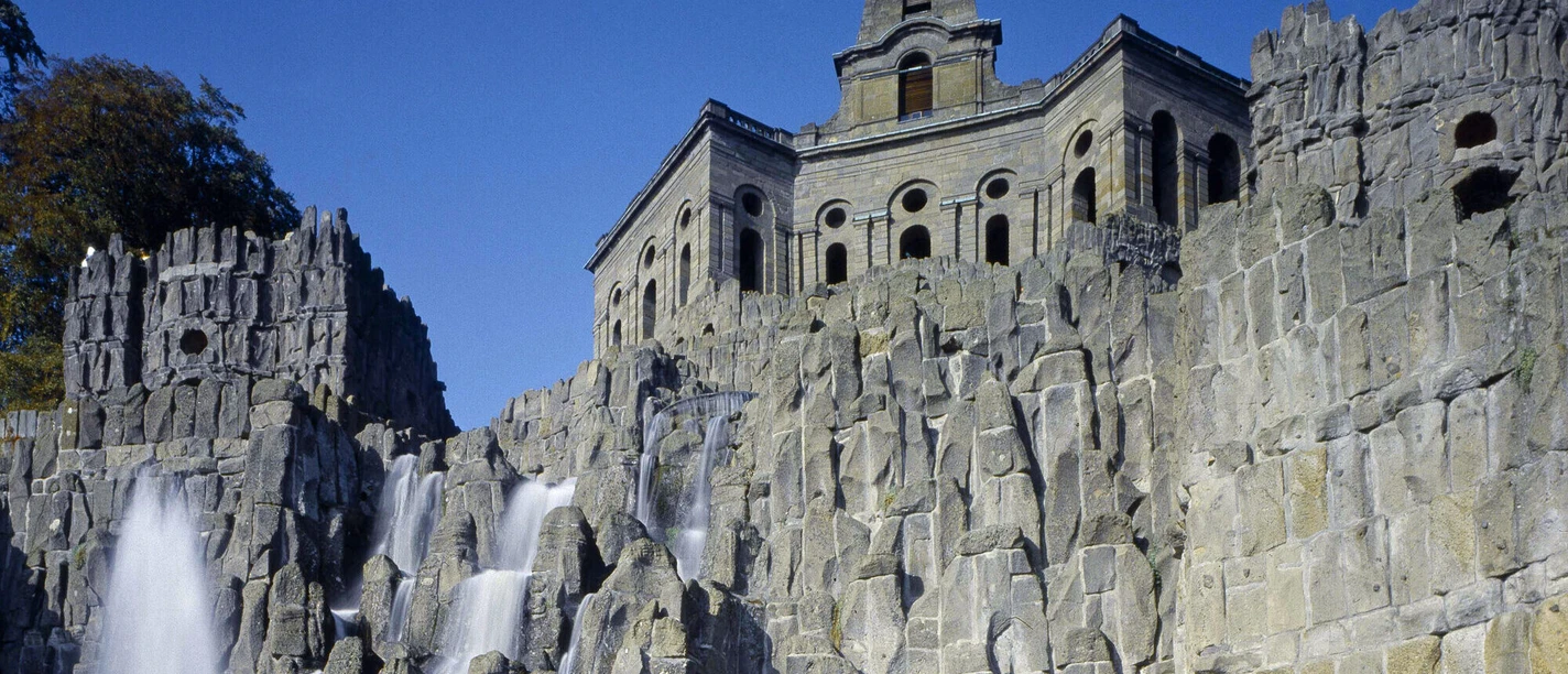 The starting point of the water games is at the foot of the octagon, on which Hercules is enthroned. Two horseshoe-shaped water staircases enclose the grotto complex. Here the water arts begin with the fountains in the artichoke pool and the crooked cascades.