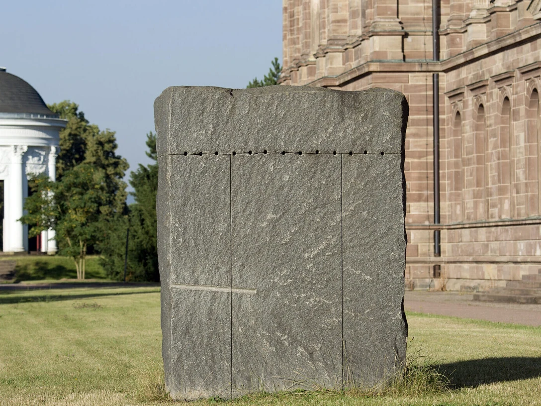 Rückriem's handling of his granite block represents a sculpture that does not destroy its material by imposing the artist's will on it. Instead, it wants to respectfully help it find its own expressive effect in the search for lost wholeness.