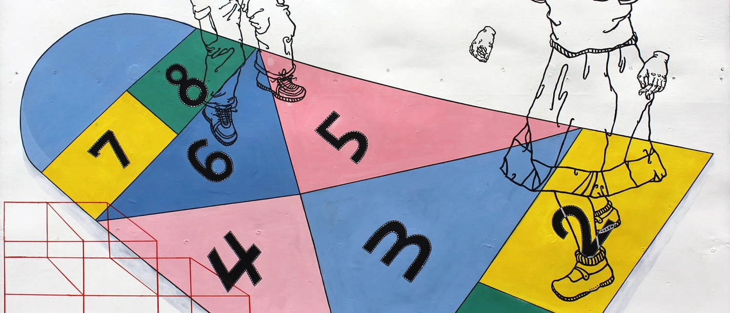 The artist knows the game Heaven and Hell from her childhood in South Korea under the name Heaven and Earth (Sambangchigi). Despite the different names, the concept is the same: a playing field is drawn on the floor into which the children throw a stone, which is then to be picked up again with a single jump.