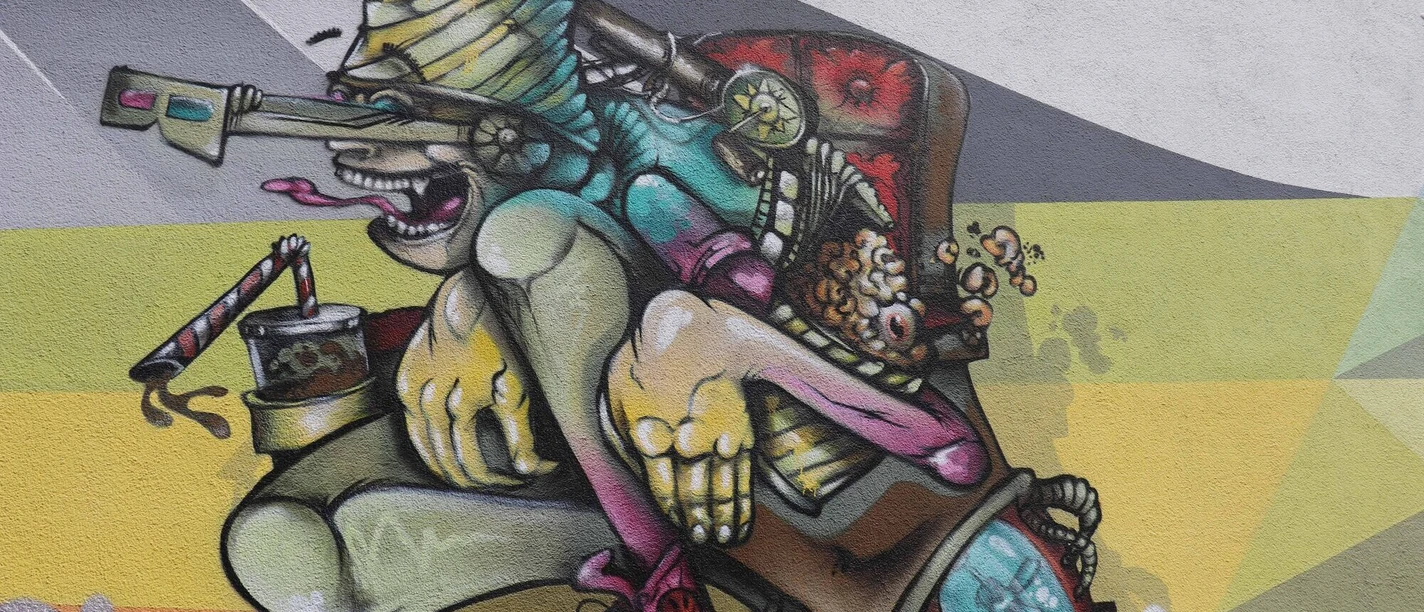 So we see the face of Alfalfa from the black-and-white films "Die kleinen Strolche" (The Little Rascals), which thrilled cinema audiences between 1922 and 1944, at the bottom left of the picture. He marvels at the rider and his horse set in motion, one of the first motifs to excite people at the end of the 19th century through devices such as the zeotrope, the forerunner of cinema. The further we look to the left side of the wall, the more we move in the direction of the cinematic present: here, high-contrast colours determine the action and as the protagonist we encounter a figure that shows how far the medium of film has developed since Alfalfa's time. For today cinemas are places that appeal to their audiences through highly equipped technology and sophisticated services.