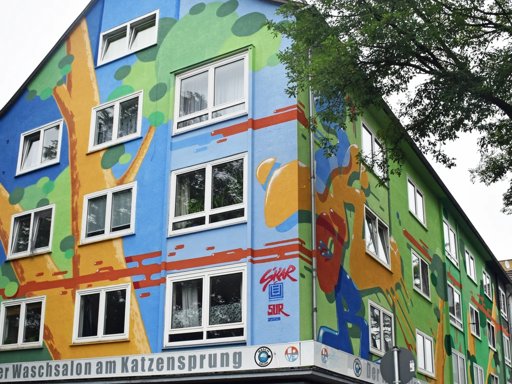 Living in a big city is wonderful. Only one thing is missing: the feeling of nature. So why not simply transport this feeling onto the street? This is exactly the question the artist SKAR asked himself and transformed the façade at Weserstraße 9 into a painting that is bursting with nature. The artist himself describes it as "urban city green".