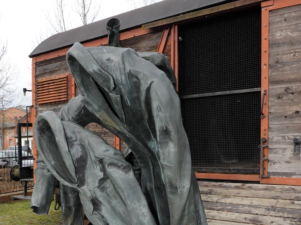 The memorial consists of several faceless bronze figures tumbling out of an original Reichsbahn wagon. It commemorates the deportation and subsequent murder of people - Jews and others - from Kassel and the deportation of forced labourers during the Nazi era.