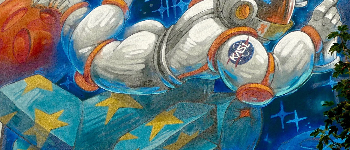 The mural is a free design entitled "Space Writers". The mural shows an astronaut moving through space and time with a couch and a spray can, and the bold design makes it fun to look at. A local reference was cleverly hidden: instead of flying for NASA, the astronaut flies for KASL.