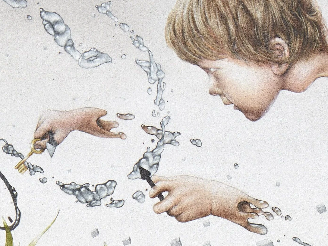 A philosophical thought experiment about time is the starting point for this large mural by Jackules. Stephen Hawking's famous goldfish in a jar features in it. The fish thinks the distorted world behind its glass prison is reality. Could humans also free themselves from the corset of time and see the world with different eyes? A little boy shows how it's done. He simply unscrews the hands of a clock: completely immersed in the here and now. And while he stirs the water, the goldfish jumps out of the glass on the left. Both float weightlessly in space - as if fallen out of time. They come together again and unite in the artist's orange graffiti signature.