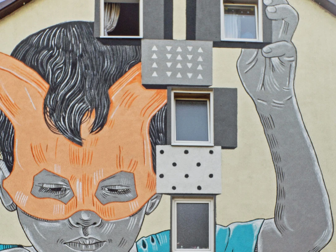 A painting by ALIAA ABOU KHADDOUR has adorned a residential building façade on Ostring since September 2021. "The Last Block" shows a boy playing with wooden blocks and wearing a fox mask. It is the first façade design by the artist, whose previous works were characterised by a filigree drawing style. The mask worn by the child absorbed in play, as well as the grey skin colour, are means for associations: Who is this boy? While many façade artists are often bothered by windows in their pictures, the artist has integrated them into her motif.