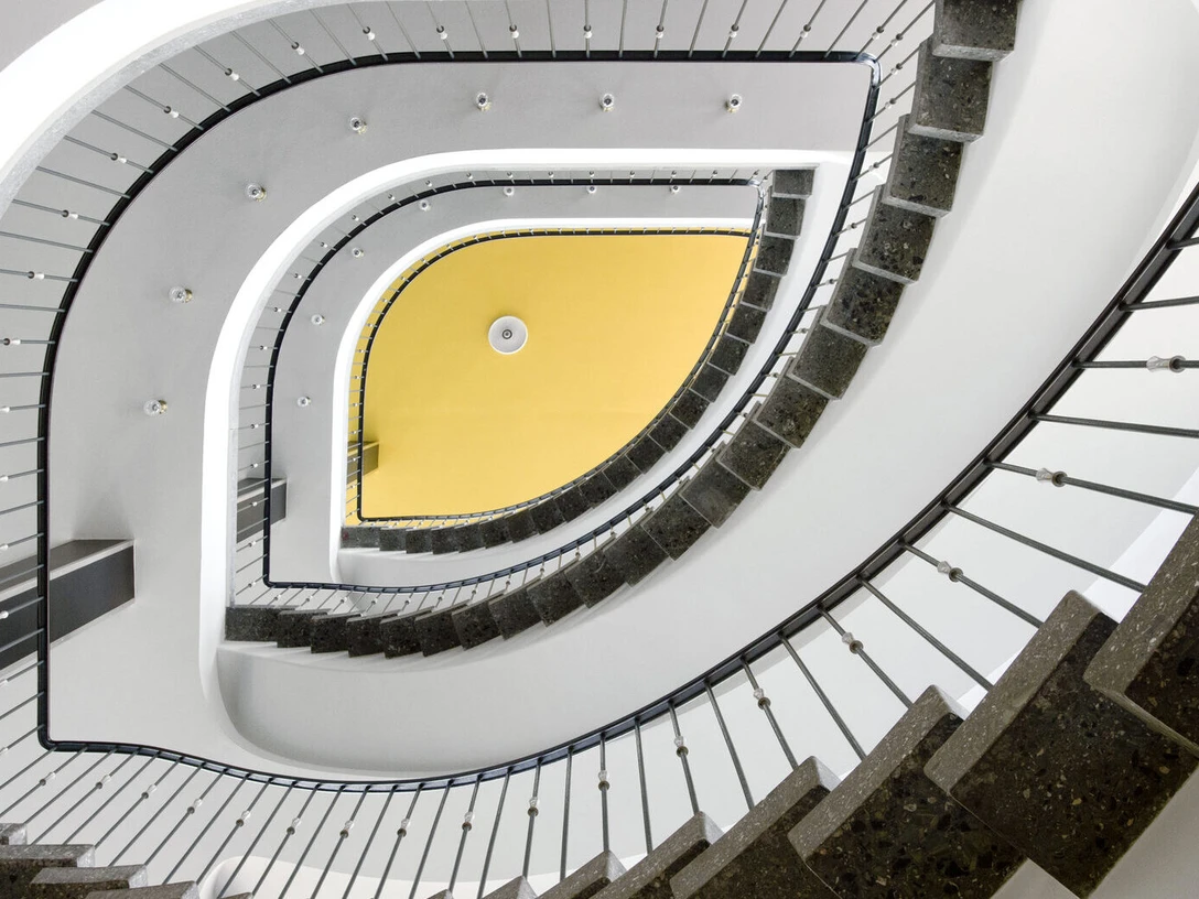 The striking staircase with its glass exterior walls in one of the earliest buildings of Kassel's post-war reconstruction was considered by Jan Hoet to be the backbone of his exhibition topography. Max Neuhaus filled this central location with an electronically generated sound installation. It develops in slight modifications over three floors. Each level is assigned its own continuous tone, each characterized by an individual timbre.
