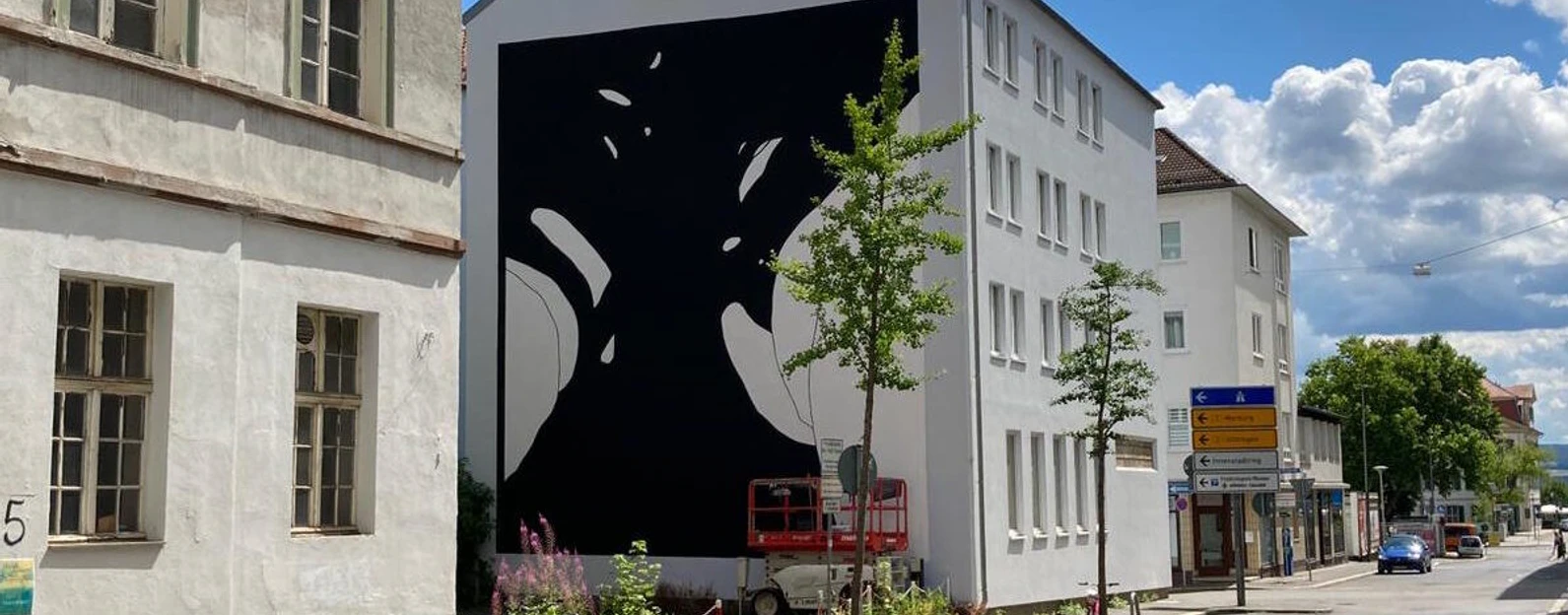 In 2020, the artist Patrick Schütze from The Unity Shop realised this design adjacent to the Hugenottenhaus, curated by KolorCubes. It was created as part of the exhibition "Moving Rooms". In the context of the design and the exhibition, there was also a workshop with children and young people from Jumpers e.V. at the Hugenottenhaus lasting several days with Patrick Schütze, in which their own artistic designs were implemented.