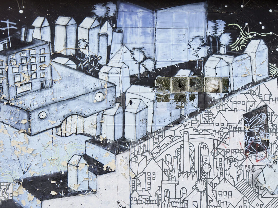 The graffito of the youth club Cluster is visible at the former location of the Kassel skateboard club Mr. Wilson. The lettering is still clearly visible on the 50-metre-long surface, with a cityscape and star images behind it. The picture by Rolle & Mors was taken around 2009. Even though the paint is already peeling, the place has historical significance. At that time, the Cluster association fought for legal graffiti spaces in the city and demanded more free spaces for youth culture. The activities now take place in the Kesselschmiede in the Rothenditmold district.
