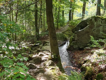 In the nature reserve "Buchenbachtal," the landscape alternates between forests and open, sometimes steep meadows. Here, sheep graze among old orchard trees, and the Geritzbach stream murmurs through a beautiful meadow valley. Benches invite you to take a seat and gaze into the distance, perhaps towards the Vogelsberg. If you follow the trail counterclockwise, you will eventually be accompanied by the babbling Buchenbach stream, leading you to the waterfall.
