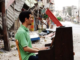 Als das belagerte Yarmouk ab 2013 zunehmend in den Strudel des syrischen Bürgerkriegs geriet, spielte Aeham mitten auf den Straßen des zerstörten Lagers – oft begleitet von singenden Kindern. Sein Klavier transportierte er auf einem Anhänger durch die Ruinen, seine Musik wurde zum Symbol des Widerstands. Videos seiner Auftritte verbreiteten sich über soziale Netzwerke und berührten Menschen weltweit.