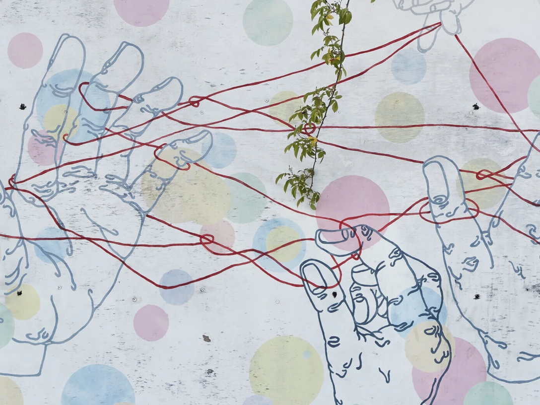 Auf kleiner Fläche ist hier ein poetisches Bild entstanden: über das Zusammenspiel von Herkunft, Erfahrung und Begegnung. In fast allen Kulturen ist das Fadenspiel bekannt. Es wird allein oder gemeinsam gespielt. Das Prinzip ist überall gleich: Der gespannte Faden wird mit den Fingern zu neuen Mustern und Figuren verwoben. Für viele ist es eine Kindheitserinnerung. Für die Künstlerin drückt es auch die Verbundenheit von Menschen, Situationen und Ereignissen aus. Alles hat mit allem zu tun. Fortlaufend entstehen neue Verknüpfungen und Vernetzungen. So wie zwischen den Kulturschaffenden im Schillerquartier.