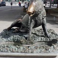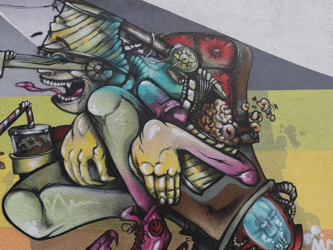 So sehen wir am linken unteren Bildrand das Gesicht von Alfalfa aus den Schwarz-Weiß Filmen „die kleinen Strolche“, die zwischen 1922 und 1944 das Kino-Publikum begeisterten. Er staunt über den in Bewegung versetzten Reiter und dessen Pferd, eines der ersten Motive das durch Apparate wie dem Zeotrop als Vorläufer des Kinos die Menschen am Ende des 19. Jahrhunderts begeisterte. Je weiter wir mit dem Blick auf die linke Seite der Wand schauen, desto mehr bewegen wir uns in Richtung der cineastischen Gegenwart: Hier bestimmen kontrastreiche Farben das Geschehen und als Protagonist begegnet uns eine Figur, an der sich festmachen lässt, wie weit sich das Medium Film seit der Zeit Alfalfas weiterentwickelt hat. Denn heute sind Kinos Orte, die durch hochgerüstete Technik und ausgefeilte Serviceangebote ihr Publikum ansprechen.