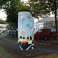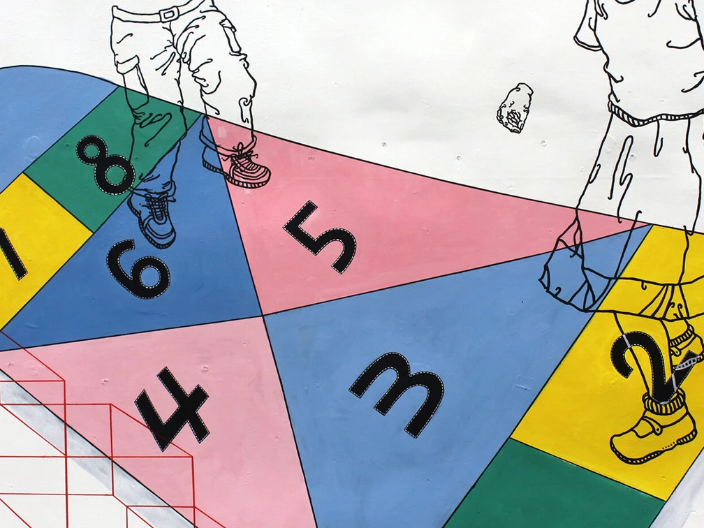 Auf dem Graffiti, welches bereits 2017 entstand, sind zwei Kinder dargestellt, die das Spiel spielen. Die Kinder haben keine Gesichter, da sie symbolisch für alle Kinder stehen. Das eine Kind geht vor, während das andere zurückkommt. Der dadurch dargestellte Kreislauf von Raum und Zeit ist mit dem daneben liegenden Fadenspiel verbunden.