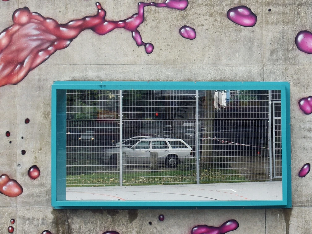 Die Hauptelemente in den Arbeiten von Jackules sind Wasser und Geometrie – so auch im kleinsten Kunstwerk des CHAPO-Projekts, das sich auf zwei Wände am Eingang des Goethe-Gymnasiums aufteilt. „Das Wasser als Element des Lebens steht in unserer Zeit der Umweltverschmutzung besonders im Fokus“, sagt Jackules. Besonders Sportlerinnen und Sportler benötigen viel Wasser und Jackules baut daher durch sein Kunstwerk eine Brücke zum Basketballplatz im Innenbereich des Goethe Gymnasiums. Die Thematik Basketball wird zudem durch das Ikosaeder aufgegriffen, das sich in der Mitte des Bildes befindet. Passend zum Basketball ist er in der Farbe Orange gestaltet.