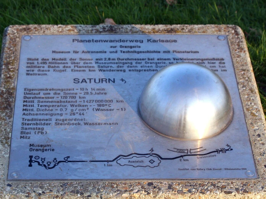 Die Sonne ist weithin sichtbar über dem gläsernen Eingang im Zentrum der Orangerie. Von hier aus passiert der Weltraumflaneur den Merkur am Rande der Karlswiese, die Venus, beide ca. haselnussgroß, dann die Erde, mit ungefähr den Dimensionen einer Walnuss. Weiter geht’s entlang der Achse der Karlsaue, zum Mars zunächst, unter der Eichenallee, zum Jupiter, der als goldene Kugel auf dem Dach des Tempelchens auf der Schwaneninsel im Aueteich und an dessen Ufer postiert ist. Der Saturn und Uranus schließlich befinden sich bereits außerhalb der Karlsaue. Und wer bis zum Neptun reisen möchte, muss weiter bis zum Radweg R1 in Guntershausen.