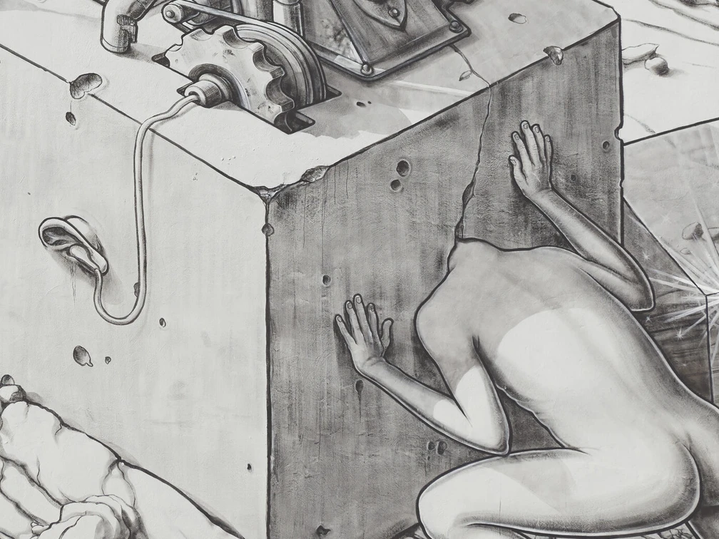 Ein surrealistisches Szenario entfaltet sich auf der großen Wand dieses mehrstöckigen Bürohauses. Drei Wochen hat der spanische Künstler Liqen 2016 an diesem detailreichen Mural gearbeitet. In der schwarz-weißen Fassadenzeichnung lassen sich Apparaturen, Überwachungsanlagen, Betonkuben und nackte menschliche Körper entdecken. Mensch und Maschine als Zwangsgemeinschaft in einer apokalyptischen Landschaft. Das Gemälde ist Vision und Mahnmal zugleich. Es zeigt eine Zukunft, in der Terror, mediale Manipulation, technologischer Fortschritt und Digitalisierung regieren. Für die Individualität und Kreativität des Menschen scheint hier kein Platz mehr zu sein.