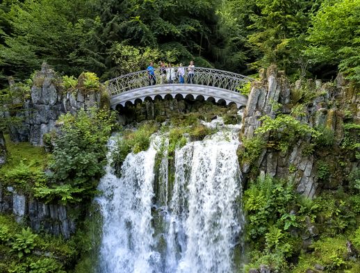Mit den Wasserspielen können Sie jedes Jahr von Mai bis Oktober ein spritziges Spektakel im Bergpark erleben, das früher den erlauchten Gästen der Landgrafen vorbehalten war: Vom Neptunbecken aus ergießt sich das sprudelnde Nass über die Kaskaden, den Steinhöfer Wasserfall, die Teufelsbrücke und das Aquädukt ins Tal und steigt dann unter dem tosenden Applaus der Zuschauer zu einer über 50 Meter hohen Fontäne auf. Mindestens so erstaunlich wie die Wasserspiele selbst ist die Tatsache, dass die historische Anlage nur durch die natürliche Kraft des Wassers betrieben wird. Für einen Lauf der Wasserspiele werden übrigens 750.000 Liter Wasser benötigt. Sie werden in großen Bassins oberhalb des Bergparks gesammelt, die ausschließlich durch Regen und natürlichen Zufluss gespeist werden.